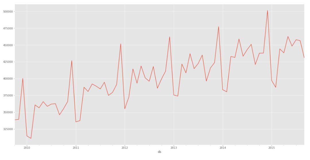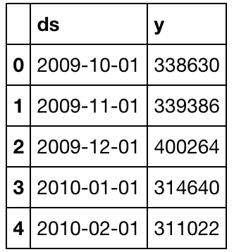 注意Dataframe的格式。需要有一个包含datetime字段的'ds'列和一个包含我们想要建模/预测的值的'y'列。