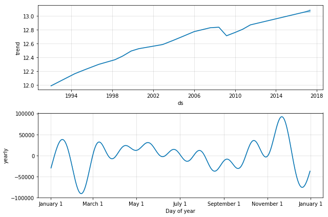 因为我们使用的是月度数据,Prophet会绘制趋势和每年的季节性,但是如果你使用的是日度数据,你会看到一个周的季节性图表。