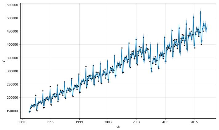 上面这张图看着怪怪的。我们把原始数据绘制在预测图上,黑点(图表底部)是我们的原始数据。为了让这个整个图表更有参考意义,我们需要把原始的y数据点绘制在这个图表上。为此,只需将sales_df dataframe中的“y_orig”列重命名为“y”即可绘制正确的数据。