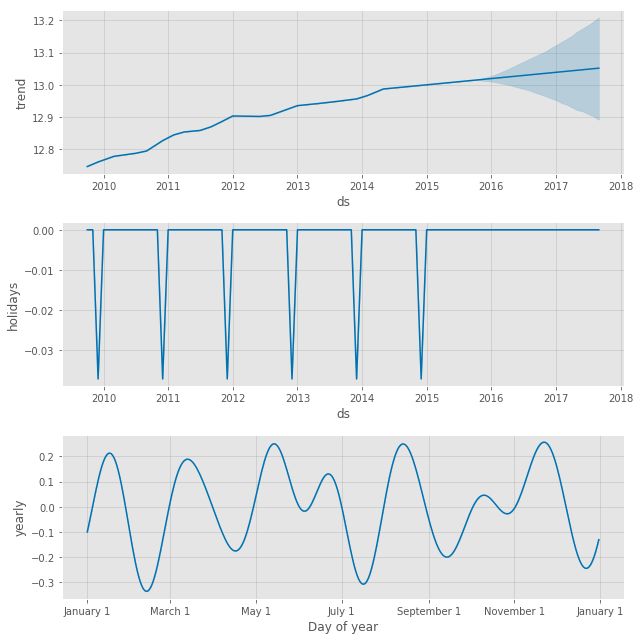 另外,Prophet的component是十分重要,因为它允许你查看模型的趋势和季节性等等: