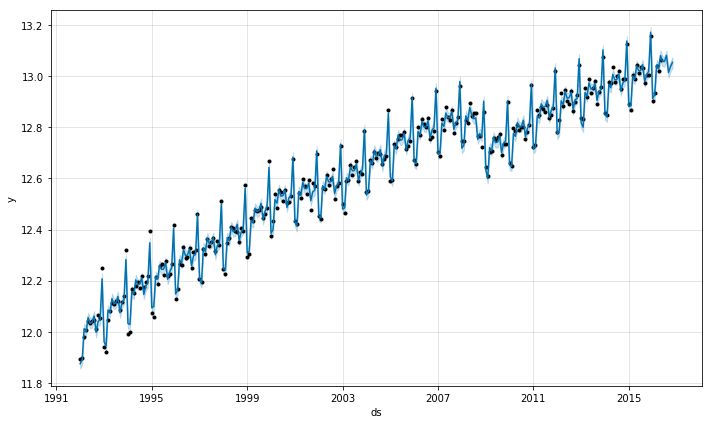 sales_df['y'] = np.log(sales_df['y']) #take the log of the data to remove trends, etc