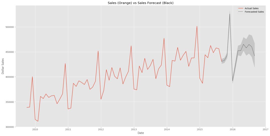 ax1.set_title('Sales (Orange) vs Sales Forecast (Black)')