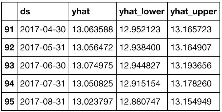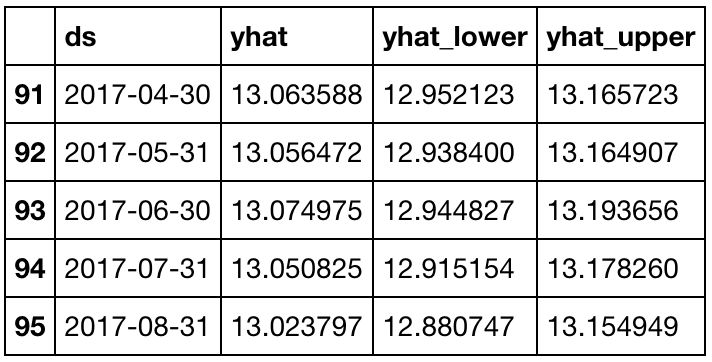 首先,我们需要将数据进行适当的组合和索引,以便开始绘图。我们只对来预测数据集的“yhat”、“yhat_lower”和“yhat_upper”列作分析。