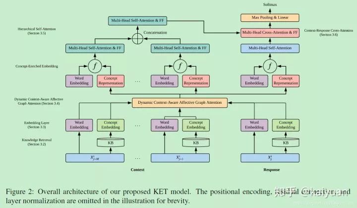 这篇是将外部常识知识用于特定的任务,在对话中的情绪识别问题,提出一种Knowledge- Enriched Transformer (KET) 框架,如下图。关于Transformer、情绪识别等背景知识不做复杂介绍,主要看看是如何将外部知识应用起来的。