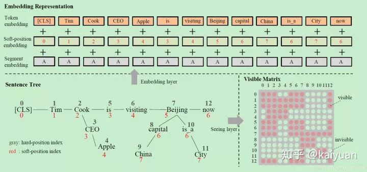 通过重排后的句子显然是毫无意义的,这里利用了position embedding来还原回结构信息。还是以上图为例,重排后,CEO和Apple被插入在了Cook和is之间,但是is应该是接在Cook之后一个位置的,那么我们直接把is的position number 设置为3即可。Segment embedding 部分同BERT一样。