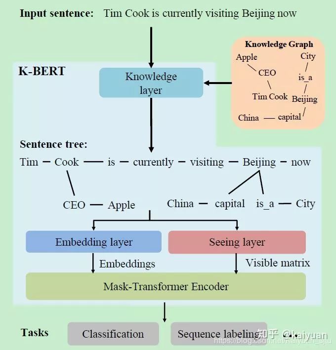 Okay,理解了大致思想之后我们来分析具体的实现方式。模型的整体框架如下图,主要包括了四个子模块: knowledge layer, embedding layer, seeing layer 和 mask-transformer。对于一个给定的输入 ,首先 knowledge layer会从一个KG中注入相关的三元组,将原来的句子转换成一个knowledge-rich的句子树;接着句子树被同时送入embedding layer和seeing layer生成一个token级别的embedding表示和一个可见矩阵(visible matrix);最后通过mask-transformer层编码后用于下游任务的输出。