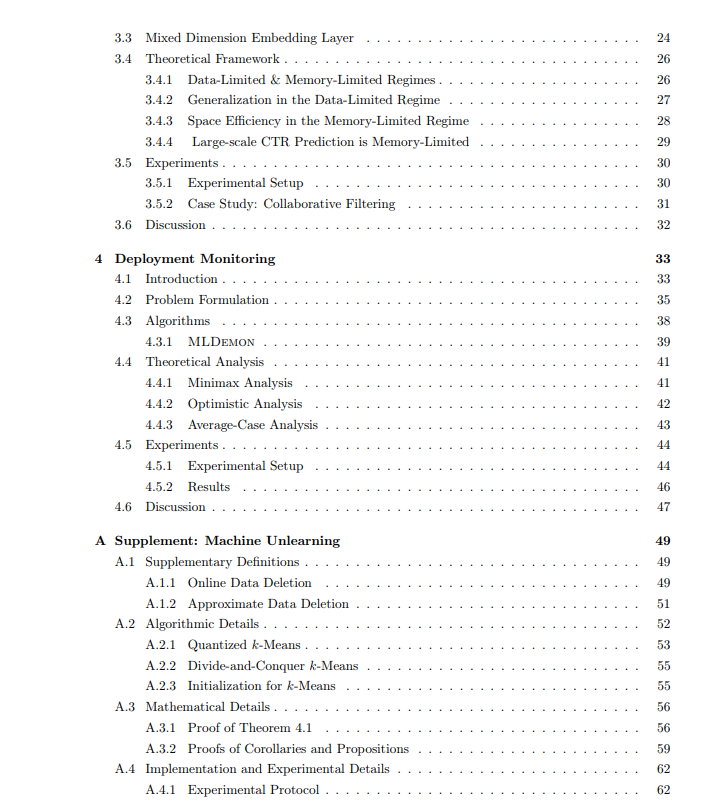 在这项工作中,我们探索了提高机器学习系统各方面效率的理论和算法。首先,我们研究了在ML中实现高效机器不学习的算法原理。我们提出了两种无监督学习算法,它们在在线数据删除方面实现了超过100倍的改进,同时产生了统计质量与标准k-means++基线相当的集群。