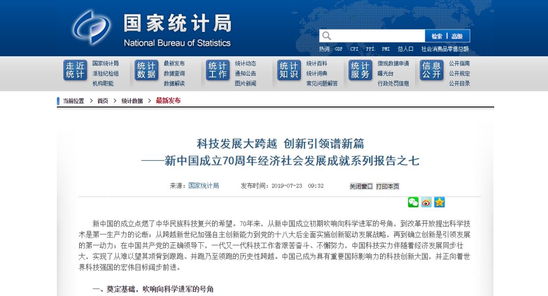 23日,国家统计局发布《科技发展大跨越,创新引领谱新篇——新中国成立70周年经济社会发展成就系列报告之七》。报告指出,中国科技实力伴随着经济发展同步壮大,实现了从难以望其项背到跟跑、并跑乃至领跑的历史性跨越。