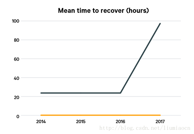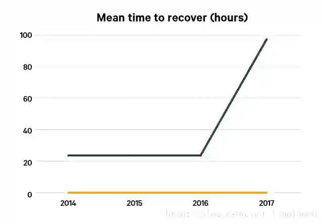 MTTR: mean time to recover from downtime 。高绩效者的MTTR少于一个小时,而低绩效者则在一天到一周之间。相比去年,低绩效者的MTTR表现更差了。