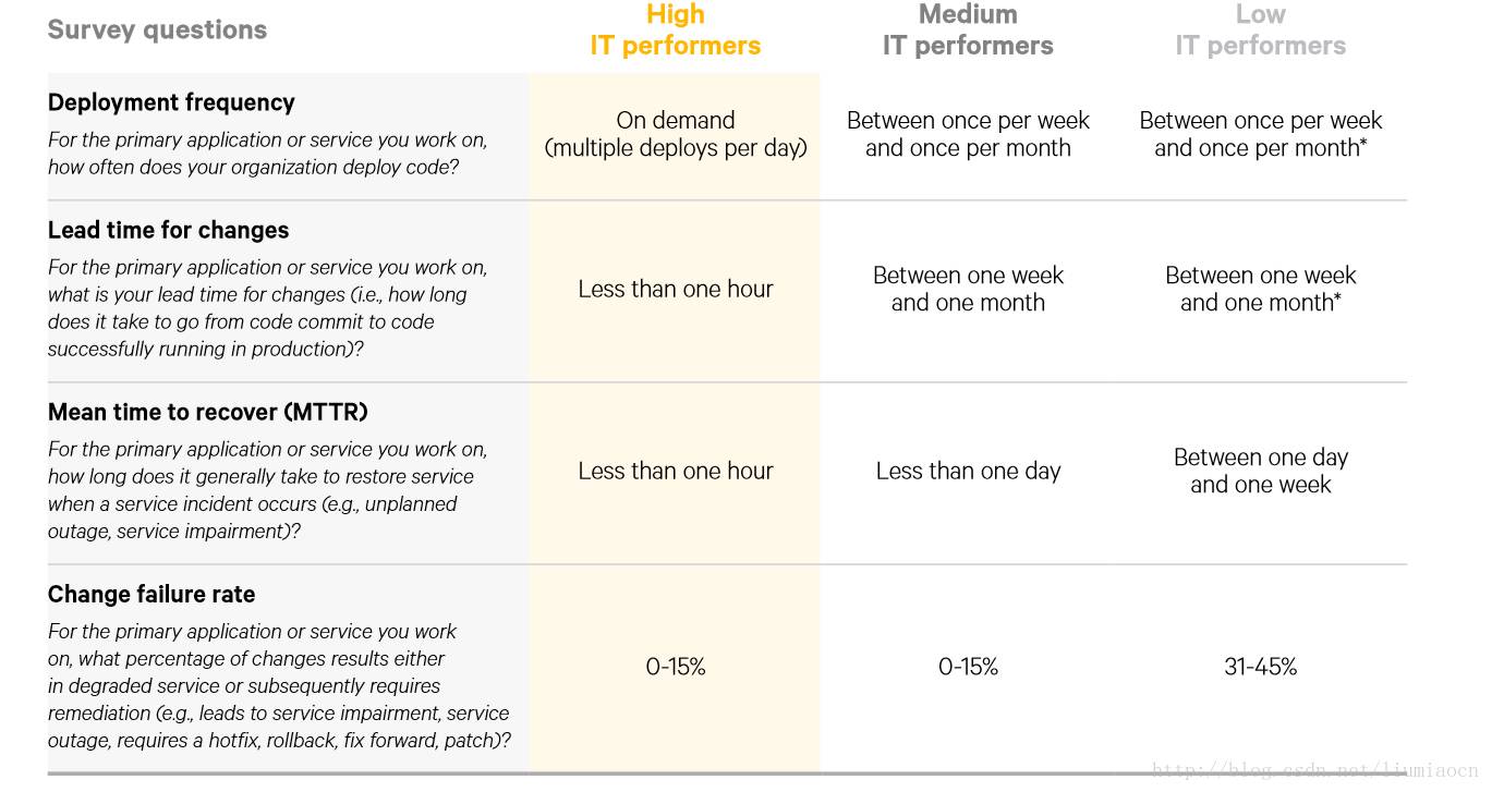 吞吐量(throughput ):用以衡量团队能够以一个怎样的频率实现从代码的提交到部署上线,这个是为了衡量多”快”