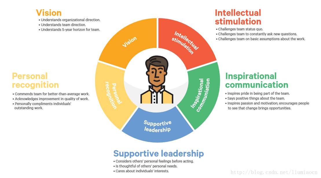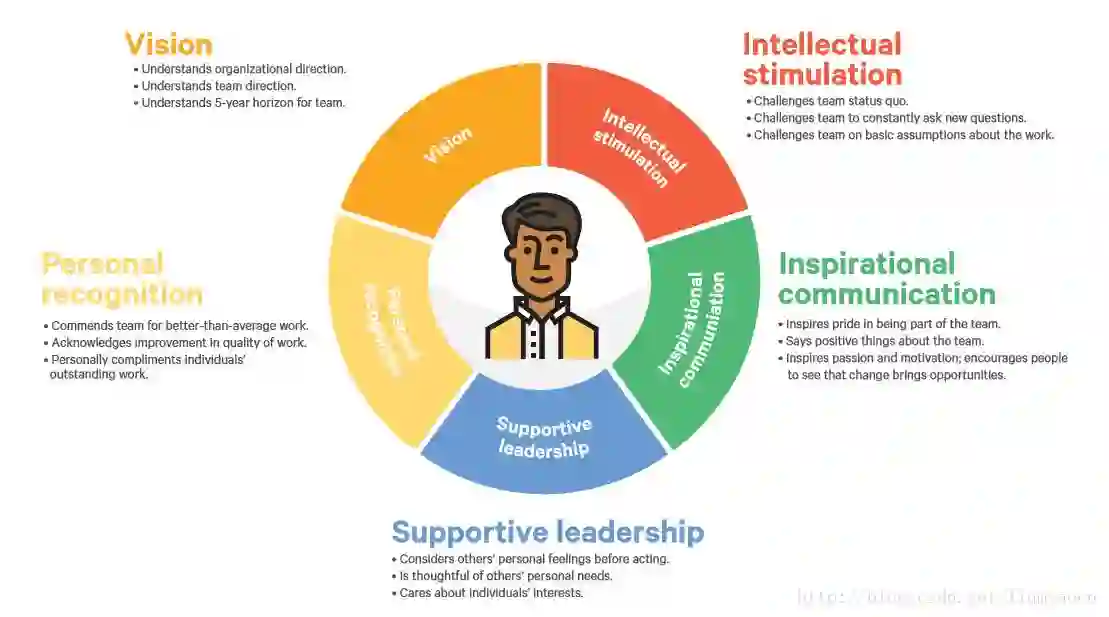 在今年的研究中我们使用了2004年Rafferty和Griffin所提出的变革型领导力模型的五个维度来分析研究,这个五个维度分别是: