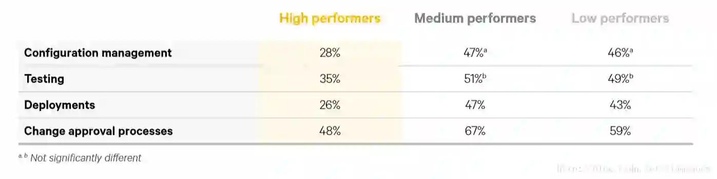 从中可以清楚地看到,无论是在配置管理和测试,还是在部署和变更审批流程上,高绩效者所进行地手工作业明显都低于低绩效者。