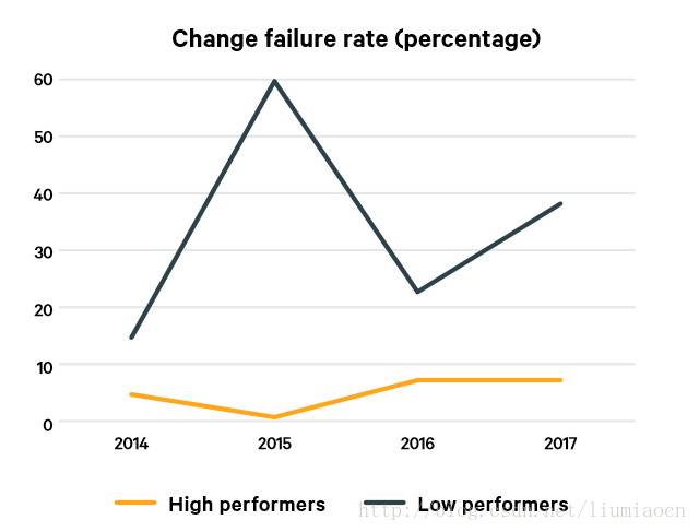 高绩效者今年与去年持平,而低绩效者大幅度提升,部署频度的差距收窄到46倍。但是值得一提的是像Etsy这样的公司平均每日部署80次而诸如Amazon和Netflix这样的公司每日部署上千次之多(生产环境中提供的服务有数百个结合而成)