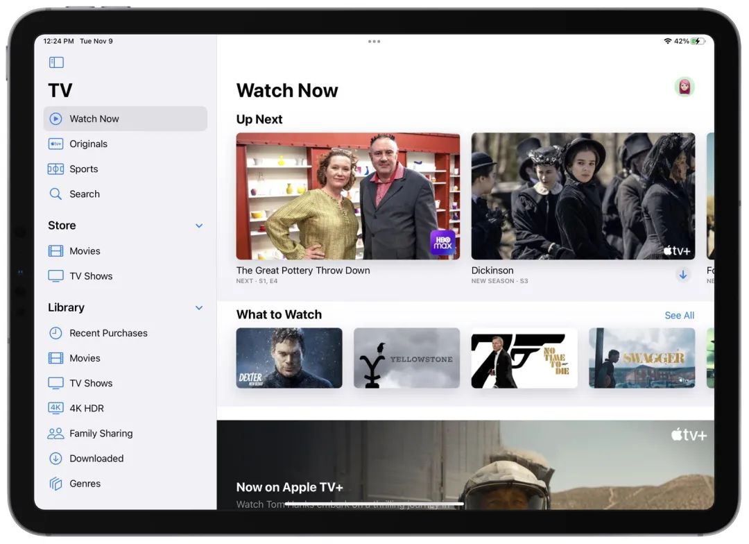 在iPadOS 15中,苹果为这款TV应用引入了一种新的设计。这款应用有一个侧边栏,可以让TV应用的各个板块之间的导航变得更简单。