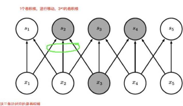 我们其实需要学习的就是里面的线上面对应的权值,比如上面绿色的代表3*1的卷积核大小,只是这里用神经网络的结构表示出来了。