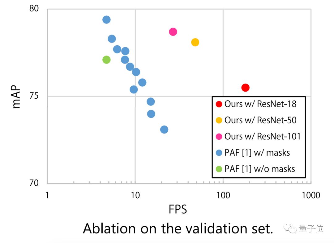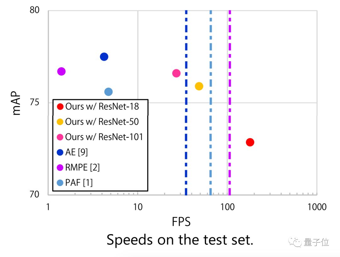 而其他方法,比如NIPS 2017 的AE(Associative embedding)、ICCV 2017的RMPE(Regional multi-person pose estimation)、CVPR 2017的PAF(Realtime multi-person 2D pose estimation using part affinity fields),都无法实现高帧数尤其是100以上帧数视频的姿态检测。