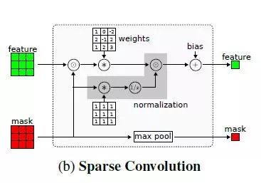 上图为稀疏卷积层的操作,其中一个圈中有一个点的图标,表示对应位置的元素相乘。*号表示卷积,输入特征可以是单通道的,也可以多通道的。