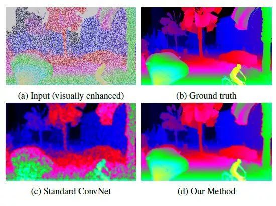(a)是稀疏的不规则的输入数据,用传统的CNNs方法,产生的结果如图(c)所示,有很多噪音,作者做提出的方法产生的结果更加平滑和准确,如图(d)所示。