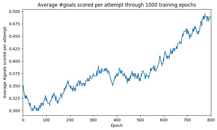 上图显示在 1000 个 epoch 中每次尝试的任意球平均数。因此,例如 epoch 700 的值为 0.45 意味着(平均)45% 的尝试需要罚球。