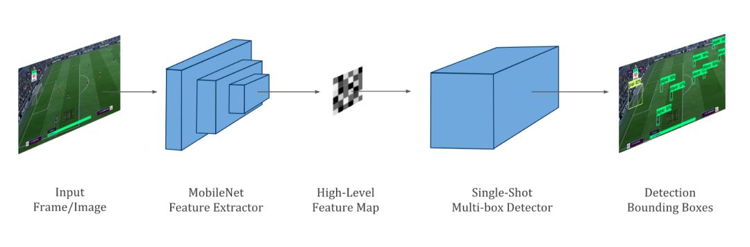 为了令智能体能理解输入图像,我们使用了一个非常紧凑的轻量级卷积网络,即 MobileNet。该网络抽取的特征图表征了智能体对图像的高级语义理解,例如理解球员和其它目标在图像中的位置。特征图随后会与单次多目标检测器一起检测球场上的球员、球与球门。