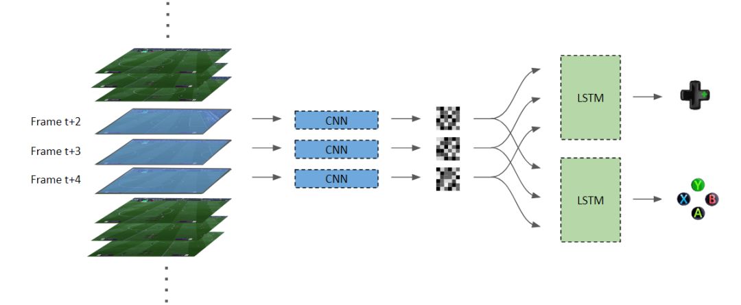 第一个 LSTM 执行的是决定玩家移动方式的学习任务。因此,这是一个多类别分类模型。第二个 LSTM 得到相同的输入,并决定采取交叉、过人、传球还是射门的动作,是另一个多类别分类模型。然后这两个分类问题的输出被转换为按键动作,来控制游戏中的动作。
