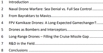 俄乌战争已在大多数战场场景中引入了无人机的大规模使用。从班排级使用的侦察无人机、打击敌后数百公里战略目标的神风无人机、能够摧毁现代海军舰艇的海上无人机,到用于引导炮火打击的监视无人机——乌克兰已成为各种技术进步和新战略思想的试验场。尽管许多专家、爱好者和士兵认为无人机是改变游戏规则的武器,但包括乌克兰著名的军事情报总局局长基里洛·布达诺夫在内的其他人,并不相信无人机具有决定性作用。除了探讨无人机能否成为战场上的决定性武器这一问题,本文还讨论了与这类武器相关的局限性,这些局限性取决于部署场景、作战环境、对手的技术水平、生产能力等因素。本文也考量了这样一种假设,即无人机将“仅仅”作为其他武器系统(从反坦克导弹到地对地导弹)的补充,并作为地面部队、侦察组和其他特种单位的通用技术支援工具。本文首先分析无人机在乌克兰使用的起源,然后描述无人机技术的相关发展,并审视无人机使用的现状以及乌克兰无人机生产的政治、经济和实践方面。本文不涉及俄罗斯无人机作战的任何方面。