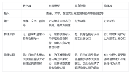 表1:物理AI与相关概念的比较(数字AI,世界模型,具身智能)。 物理AI定义中所包含的“行为驱动的学习能力”这一思想可以追溯至上个世纪90年代人工智能学界的观点,当时的部分学者认为思考离不开物理形体 [3]。Aslan Miriyev和Mirko Kovac两位学者在2020年Skills for Physical Artifical Intelligence一文中正式提出了物理AI的概念,将物理AI作为传统数字AI的对应,号召科研人员在人工智能及机器人的设计过程中充分考虑AI的物理形体,给予AI在现实世界的互动能力 [4]。英伟达公司CEO黄仁勋在2025年1月举办的美国消费类电子产品展览会(CES)上发表演讲时,重点提到物理AI,并认为物理AI将引领人工智能领域的新一波浪潮、将其称之为人工智能的新前沿。