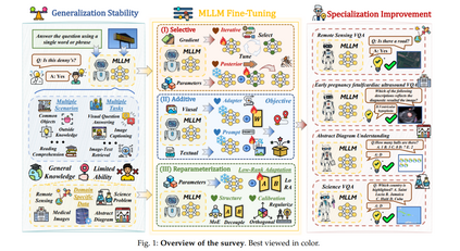 摘要——多模态大语言模型(Multimodal Large Language Models,MLLMs)通过融合视觉与语言推理能力,能够应对图像描述、视觉问答等复杂任务。尽管 MLLMs 展现出卓越的通用性,但在特定应用场景中的性能仍然受限。针对下游任务对 MLLMs 进行调优主要面临两大关键挑战:任务专家化(Task-Expert Specialization),即预训练数据分布与目标任务数据分布之间的差异限制了目标性能的提升;以及开放世界稳定性(Open-World Stabilization),即灾难性遗忘会导致模型丧失原有的通用知识。本文系统性地综述了近年来 MLLM 下游调优方法的最新进展,并将其归纳为三种范式:(I)选择性调优(Selective Tuning)、(II)加性调优(Additive Tuning)以及(III)重参数化调优(Reparameterization Tuning)。此外,我们在多种主流 MLLM 架构和多样化下游任务上对这些调优策略进行了系统基准评测,以建立标准化的评估分析框架和系统性的调优原则。最后,我们总结了该领域中仍然存在的若干开放挑战,并提出了未来的研究方向。为促进这一快速发展领域的持续进步,我们还提供了一个持续更新的公共资源库,用于跟踪相关研究进展:https://github.com/WenkeHuang/Awesome-MLLM-Tuning。 **关键词——**多模态大语言模型,下游调优,专用能力提升,泛化稳定性
