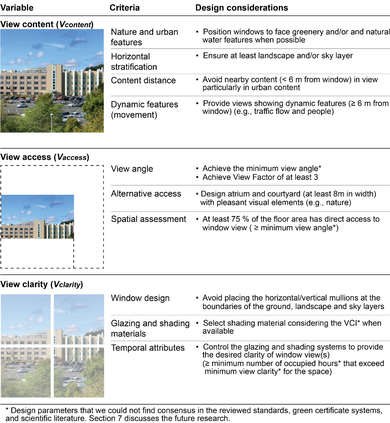 View-out is one of the architectural design parameters that influence the occupants' health and well-being. This article conducts a critical literature review on building standards, rating systems, and scientific studies that provide evaluation methods and guidelines for quality view-out. Based on the literature review, we identify primary variables for the quality of view-out, describe each variable's criteria, and propose recommendations for window design that ensure quality view-out.