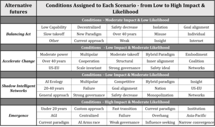 Artificial Intelligence (AI) is one of the most transformative technologies of the 21st century. The extent and scope of future AI capabilities remain a key uncertainty, with widespread disagreement on timelines and potential impacts. As nations and technology companies race toward greater complexity and autonomy in AI systems, there are concerns over the extent of integration and oversight of opaque AI decision processes. This is especially true in the subfield of machine learning (ML), where systems learn to optimize objectives without human assistance. Objectives can be imperfectly specified or executed in an unexpected or potentially harmful way. This becomes more concerning as systems increase in power and autonomy, where an abrupt capability jump could result in unexpected shifts in power dynamics or even catastrophic failures. This study presents a hierarchical complex systems framework to model AI risk and provide a template for alternative futures analysis. Survey data were collected from domain experts in the public and private sectors to classify AI impact and likelihood. The results show increased uncertainty over the powerful AI agent scenario, confidence in multiagent environments, and increased concern over AI alignment failures and influence-seeking behavior.