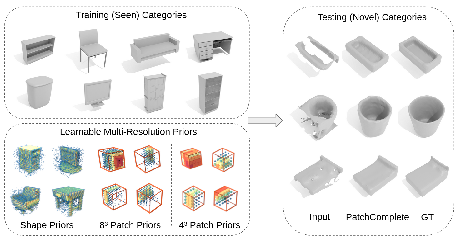 While 3D shape representations enable powerful reasoning in many visual and perception applications, learning 3D shape priors tends to be constrained to the specific categories trained on, leading to an inefficient learning process, particularly for general applications with unseen categories. Thus, we propose PatchComplete, which learns effective shape priors based on multi-resolution local patches, which are often more general than full shapes (e.g., chairs and tables often both share legs) and thus enable geometric reasoning about unseen class categories. To learn these shared substructures, we learn multi-resolution patch priors across all train categories, which are then associated to input partial shape observations by attention across the patch priors, and finally decoded into a complete shape reconstruction. Such patch-based priors avoid overfitting to specific train categories and enable reconstruction on entirely unseen categories at test time. We demonstrate the effectiveness of our approach on synthetic ShapeNet data as well as challenging real-scanned objects from ScanNet, which include noise and clutter, improving over state of the art in novel-category shape completion by 19.3% in chamfer distance on ShapeNet, and 9.0% for ScanNet.