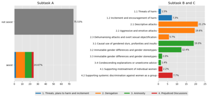 The widespread popularity of social media has led to an increase in hateful, abusive, and sexist language, motivating methods for the automatic detection of such phenomena. The goal of the SemEval shared task \textit{Towards Explainable Detection of Online Sexism} (EDOS 2023) is to detect sexism in English social media posts (subtask A), and to categorize such posts into four coarse-grained sexism categories (subtask B), and eleven fine-grained subcategories (subtask C). In this paper, we present our submitted systems for all three subtasks, based on a multi-task model that has been fine-tuned on a range of related tasks and datasets before being fine-tuned on the specific EDOS subtasks. We implement multi-task learning by formulating each task as binary pairwise text classification, where the dataset and label descriptions are given along with the input text. The results show clear improvements over a fine-tuned DeBERTa-V3 serving as a baseline leading to $F_1$-scores of 85.9\% in subtask A (rank 13/84), 64.8\% in subtask B (rank 19/69), and 44.9\% in subtask C (26/63).