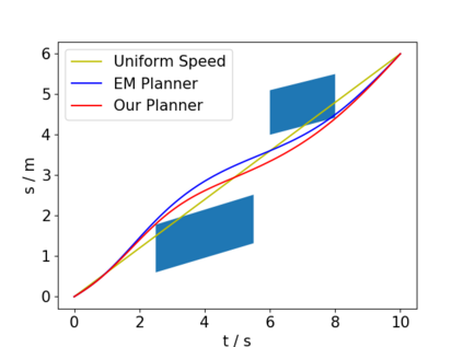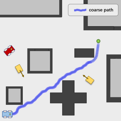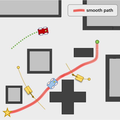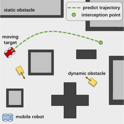 翻译:拦截移动目标是一个广泛研究的问题。 在本文中, 我们提出在动态环境中用轮式移动机器人拦截移动目标的算法。 我们首先通过多式装配预测目标的未来位置。 算法随后产生一条截取路径和速度脱钩的轨迹。 我们使用混合 A* 搜索来规划一条路径, 并通过梯度等式方法优化它。 为了避免环境中的动态障碍, 我们引入ST 图表来进行速度规划。 速度曲线由小盘 B\' ezier 曲线代表, 以便进一步优化。 与其他截取算法相比, 我们考虑一个动态环境, 并计划一个安全轨迹, 满足轮式机器人的动态特征, 同时确保截取的准确性。 模拟显示算法成功完成截取任务, 并且具有很高的计算效率 。