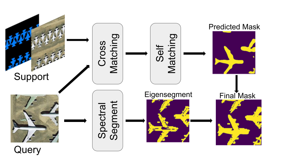 Remote sensing image semantic segmentation is an important problem for remote sensing image interpretation. Although remarkable progress has been achieved, existing deep neural network methods suffer from the reliance on massive training data. Few-shot remote sensing semantic segmentation aims at learning to segment target objects from a query image using only a few annotated support images of the target class. Most existing few-shot learning methods stem primarily from their sole focus on extracting information from support images, thereby failing to effectively address the large variance in appearance and scales of geographic objects. To tackle these challenges, we propose a Self-Correlation and Cross-Correlation Learning Network for the few-shot remote sensing image semantic segmentation. Our model enhances the generalization by considering both self-correlation and cross-correlation between support and query images to make segmentation predictions. To further explore the self-correlation with the query image, we propose to adopt a classical spectral method to produce a class-agnostic segmentation mask based on the basic visual information of the image. Extensive experiments on two remote sensing image datasets demonstrate the effectiveness and superiority of our model in few-shot remote sensing image semantic segmentation. Code and models will be accessed at https://github.com/linhanwang/SCCNet.