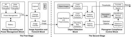 The retail sector presents several open and challenging problems that could benefit from advanced pattern recognition and computer vision techniques. One such critical challenge is planogram compliance control. In this study, we propose a complete embedded system to tackle this issue. Our system consists of four key components as image acquisition and transfer via stand-alone embedded camera module, object detection via computer vision and deep learning methods working on single board computers, planogram compliance control method again working on single board computers, and energy harvesting and power management block to accompany the embedded camera modules. The image acquisition and transfer block is implemented on the ESP-EYE camera module. The object detection block is based on YOLOv5 as the deep learning method and local feature extraction. We implement these methods on Raspberry Pi 4, NVIDIA Jetson Orin Nano, and NVIDIA Jetson AGX Orin as single board computers. The planogram compliance control block utilizes sequence alignment through a modified Needleman-Wunsch algorithm. This block is also working along with the object detection block on the same single board computers. The energy harvesting and power management block consists of solar and RF energy harvesting modules with suitable battery pack for operation. We tested the proposed embedded planogram compliance control system on two different datasets to provide valuable insights on its strengths and weaknesses. The results show that our method achieves F1 scores of 0.997 and 1.0 in object detection and planogram compliance control blocks, respectively. Furthermore, we calculated that the complete embedded system can work in stand-alone form up to two years based on battery. This duration can be further extended with the integration of the proposed solar and RF energy harvesting options.