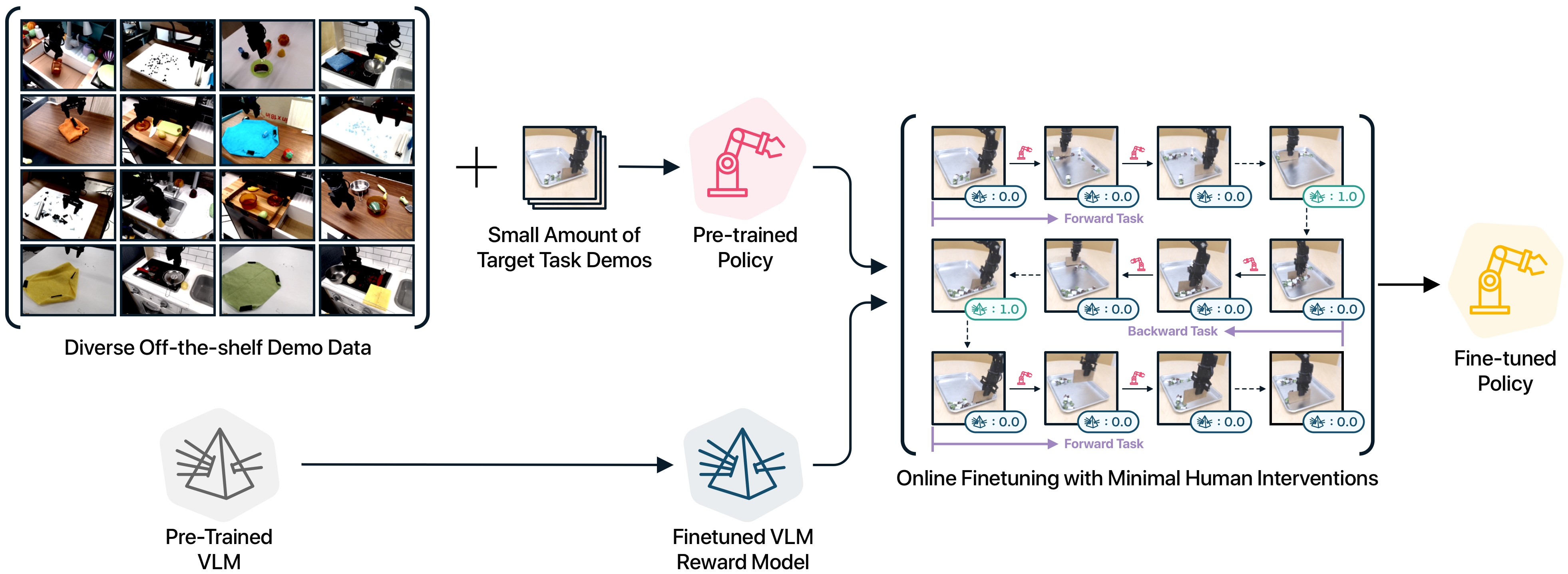 The pre-train and fine-tune paradigm in machine learning has had dramatic success in a wide range of domains because the use of existing data or pre-trained models on the internet enables quick and easy learning of new tasks. We aim to enable this paradigm in robotic reinforcement learning, allowing a robot to learn a new task with little human effort by leveraging data and models from the Internet. However, reinforcement learning often requires significant human effort in the form of manual reward specification or environment resets, even if the policy is pre-trained. We introduce RoboFuME, a reset-free fine-tuning system that pre-trains a multi-task manipulation policy from diverse datasets of prior experiences and self-improves online to learn a target task with minimal human intervention. Our insights are to utilize calibrated offline reinforcement learning techniques to ensure efficient online fine-tuning of a pre-trained policy in the presence of distribution shifts and leverage pre-trained vision language models (VLMs) to build a robust reward classifier for autonomously providing reward signals during the online fine-tuning process. In a diverse set of five real robot manipulation tasks, we show that our method can incorporate data from an existing robot dataset collected at a different institution and improve on a target task within as little as 3 hours of autonomous real-world experience. We also demonstrate in simulation experiments that our method outperforms prior works that use different RL algorithms or different approaches for predicting rewards. Project website: https://robofume.github.io