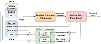 Radio-based methods such as Ultra-Wideband (UWB) and RAdio Detection And Ranging (radar), which have traditionally seen limited adoption in robotics, are experiencing a boost in popularity thanks to their robustness to harsh environmental conditions and cluttered environments. This work proposes a multi-robot UGV-UAV localization system that leverages the two technologies with inexpensive and readily-available sensors, such as Inertial Measurement Units (IMUs) and wheel encoders, to estimate the relative position of an aerial robot with respect to a ground robot. The first stage of the system pipeline includes a nonlinear optimization framework to trilaterate the location of the aerial platform based on UWB range data, and a radar pre-processing module with loosely coupled ego-motion estimation which has been adapted for a multi-robot scenario. Then, the pre-processed radar data as well as the relative transformation are fed to a pose-graph optimization framework with odometry and inter-robot constraints. The system, implemented for the Robotic Operating System (ROS 2) with the Ceres optimizer, has been validated in Software-in-the-Loop (SITL) simulations and in a real-world dataset. The proposed relative localization module outperforms state-of-the-art closed-form methods which are less robust to noise. Our SITL environment includes a custom Gazebo plugin for generating realistic UWB measurements modeled after real data. Conveniently, the proposed factor graph formulation makes the system readily extensible to full Simultaneous Localization And Mapping (SLAM). Finally, all the code and experimental data is publicly available to support reproducibility and to serve as a common open dataset for benchmarking.