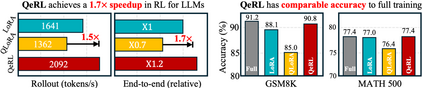 We propose QeRL, a Quantization-enhanced Reinforcement Learning framework for large language models (LLMs). While RL is essential for LLMs' reasoning capabilities, it is resource-intensive, requiring substantial GPU memory and long rollout durations. QeRL addresses these issues by combining NVFP4 quantization with Low-Rank Adaptation (LoRA), accelerating rollout phase of RL while reducing memory overhead. Beyond efficiency, our findings show that quantization noise increases policy entropy, enhancing exploration, and enabling the discovery of better strategies during RL. To further optimize exploration, QeRL introduces an Adaptive Quantization Noise (AQN) mechanism, which dynamically adjusts noise during training. Experiments demonstrate that QeRL delivers over 1.5 times speedup in the rollout phase. Moreover, this is the first framework to enable RL training of a 32B LLM on a single H100 80GB GPU, while delivering overall speedups for RL training. It also achieves faster reward growth and higher final accuracy than 16-bit LoRA and QLoRA, while matching the performance of full-parameter fine-tuning on mathematical benchmarks such as GSM8K (90.8%) and MATH 500 (77.4%) in the 7B model. These results establish QeRL as an efficient and effective framework for RL training in LLMs.