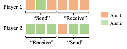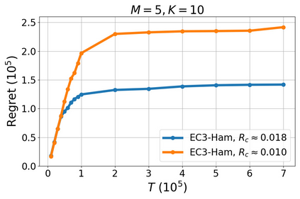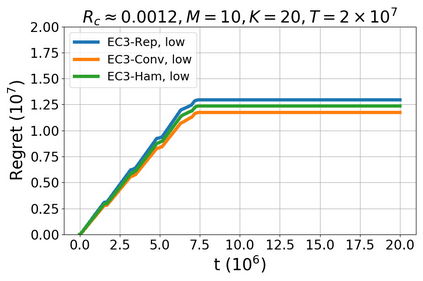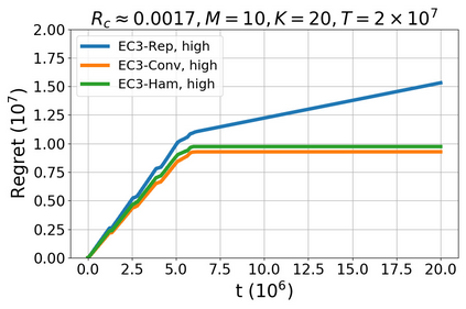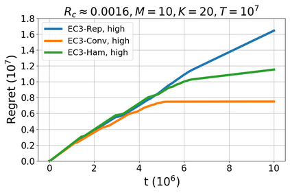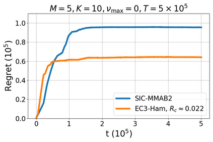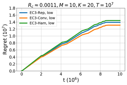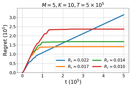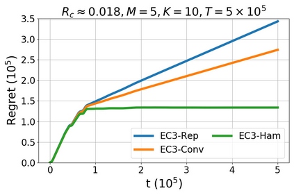 翻译:我们研究的是一个新的多玩家多臂强盗问题(MP-MAB),如果手臂发生碰撞,奖励分配就会发生变化。现有的文献总是假定在碰撞发生时对所涉玩家给予零奖励,但对于认知收音机等应用来说,更现实的情景是碰撞会减少平均奖励,但不一定是零。我们侧重于更实际的无观测环境,让玩家不直接看到碰撞,并提出错误校正协调通信(EC3)算法,模型将通信隐含为可靠的通信,而不是吵闹的频道问题,为此,随机编码错误会被用来证明任何通信协议都无法战胜的最佳遗憾。最后,优化代码长度与解码错误率之间的权衡,导致遗憾接近中央MP-MAB的遗憾,这代表了自然下限。在合成和真实世界数据集上实际错误校正代码的实验显示了EC3的优势。特别是,结果显示,编码计划的选择对后悔表现产生了深远的影响。