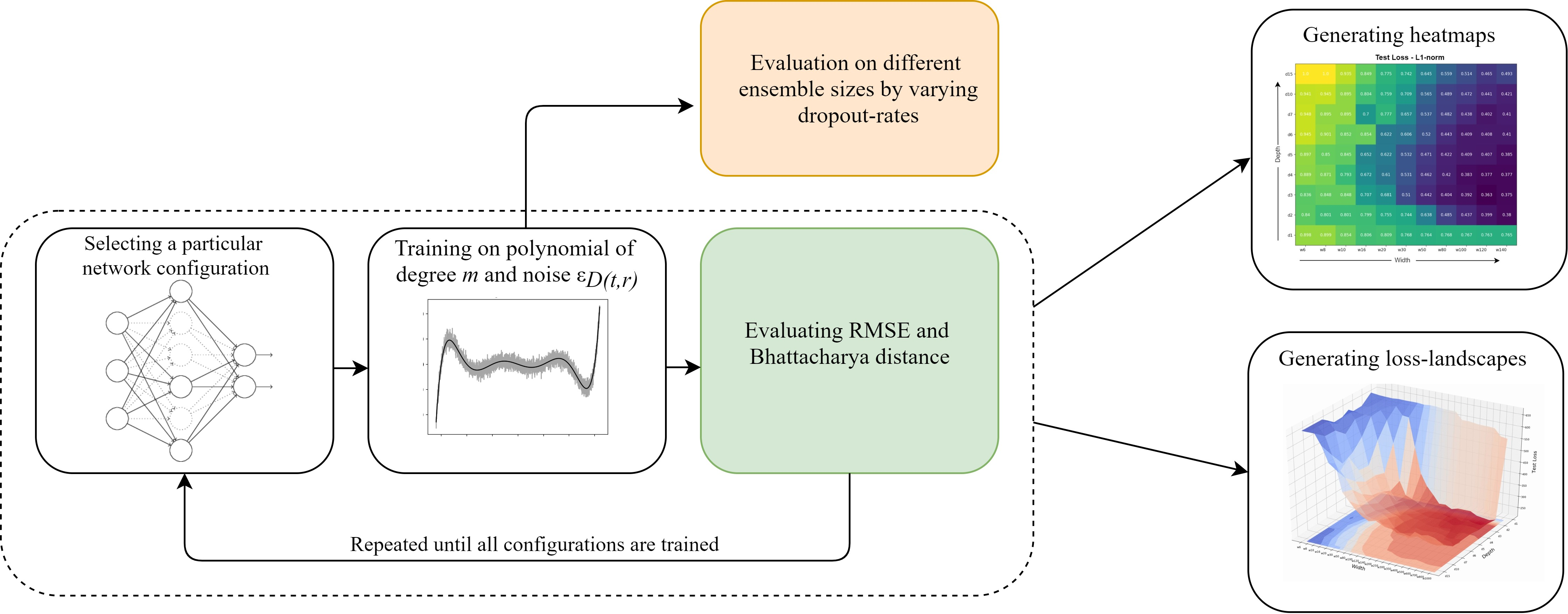 Advances in neural architecture search, as well as explainability and interpretability of connectionist architectures, have been reported in the recent literature. However, our understanding of how to design Bayesian Deep Learning (BDL) hyperparameters, specifically, the depth, width and ensemble size, for robust function mapping with uncertainty quantification, is still emerging. This paper attempts to further our understanding by mapping Bayesian connectionist representations to polynomials of different orders with varying noise types and ratios. We examine the noise-contaminated polynomials to search for the combination of hyperparameters that can extract the underlying polynomial signals while quantifying uncertainties based on the noise attributes. Specifically, we attempt to study the question that an appropriate neural architecture and ensemble configuration can be found to detect a signal of any n-th order polynomial contaminated with noise having different distributions and signal-to-noise (SNR) ratios and varying noise attributes. Our results suggest the possible existence of an optimal network depth as well as an optimal number of ensembles for prediction skills and uncertainty quantification, respectively. However, optimality is not discernible for width, even though the performance gain reduces with increasing width at high values of width. Our experiments and insights can be directional to understand theoretical properties of BDL representations and to design practical solutions.