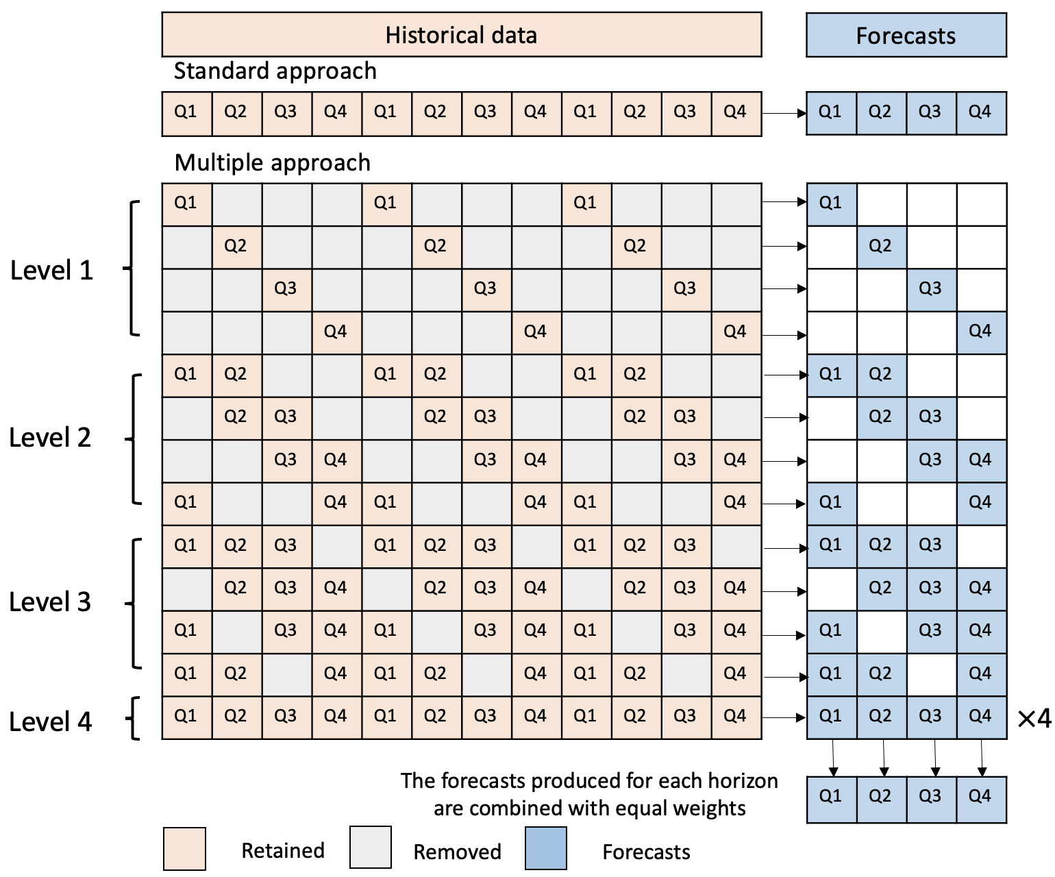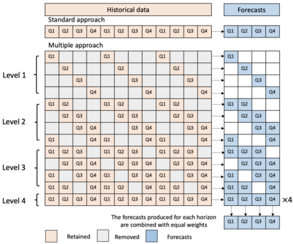 翻译:时间序列预测在现代商业决策中发挥着越来越重要的作用。在当今数据丰富的环境中,人们往往要选择数据的最佳预测模型。然而,确定最佳模型需要专业知识和经验,准确预测具有挑战性的任务。为了减轻模型选择的重要性,我们提议了一个简单可靠的算法来改善预测性能。具体地说,我们用最初时间序列中不同的分季节序列来构建多个时间序列。这些衍生序列突出原始系列的不同季节以下模式,使得预测方法能够捕捉数据的不同模式和组成部分。随后,我们将这些多系列的预测与传统的统计模型(ETS或ARIMA)分开进行。最后,这些预测是结合的。我们从点预报和预测间隔的角度评价我们广泛使用的竞争预测数据集(M1、M3和M4)的方法。我们观察与基准相比的绩效改进。我们的方法特别适合和有力,用于更频繁的数据。为了显示我们的观点的实际价值,我们用小时负荷数据的方法展示了绩效的改进情况,展示了多季节模式。