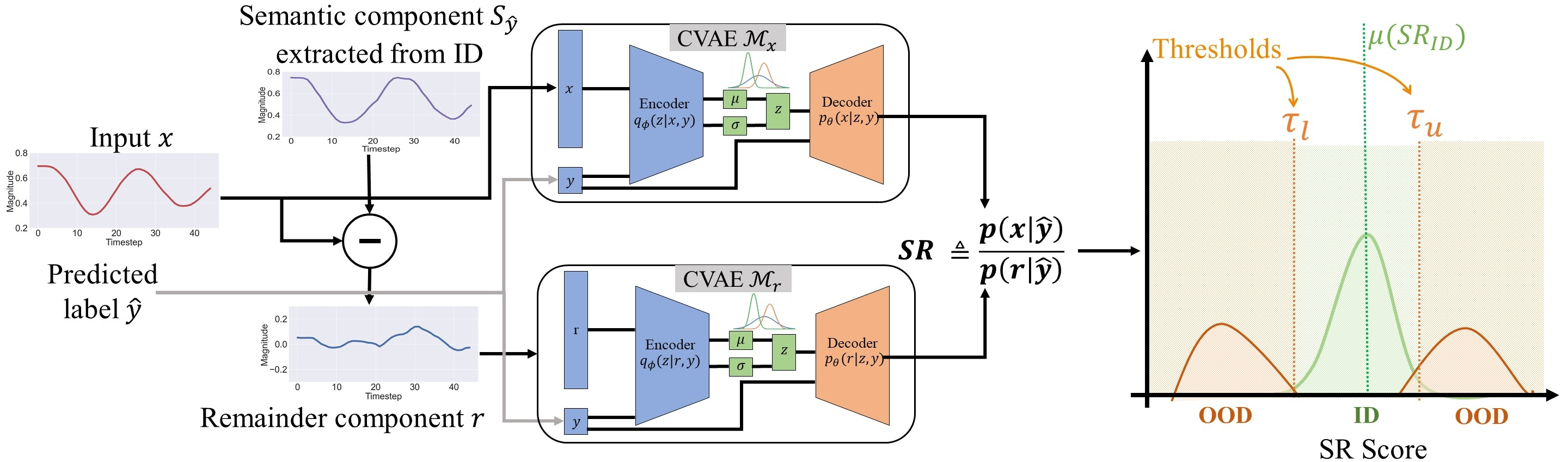 Safe deployment of time-series classifiers for real-world applications relies on the ability to detect the data which is not generated from the same distribution as training data. This task is referred to as out-of-distribution (OOD) detection. We consider the novel problem of OOD detection for the time-series domain. We discuss the unique challenges posed by time-series data and explain why prior methods from the image domain will perform poorly. Motivated by these challenges, this paper proposes a novel {\em Seasonal Ratio Scoring (SRS)} approach. SRS consists of three key algorithmic steps. First, each input is decomposed into class-wise semantic component and remainder. Second, this decomposition is employed to estimate the class-wise conditional likelihoods of the input and remainder using deep generative models. The seasonal ratio score is computed from these estimates. Third, a threshold interval is identified from the in-distribution data to detect OOD examples. Experiments on diverse real-world benchmarks demonstrate that the SRS method is well-suited for time-series OOD detection when compared to baseline methods. Open-source code for SRS method is provided at https://github.com/tahabelkhouja/SRS