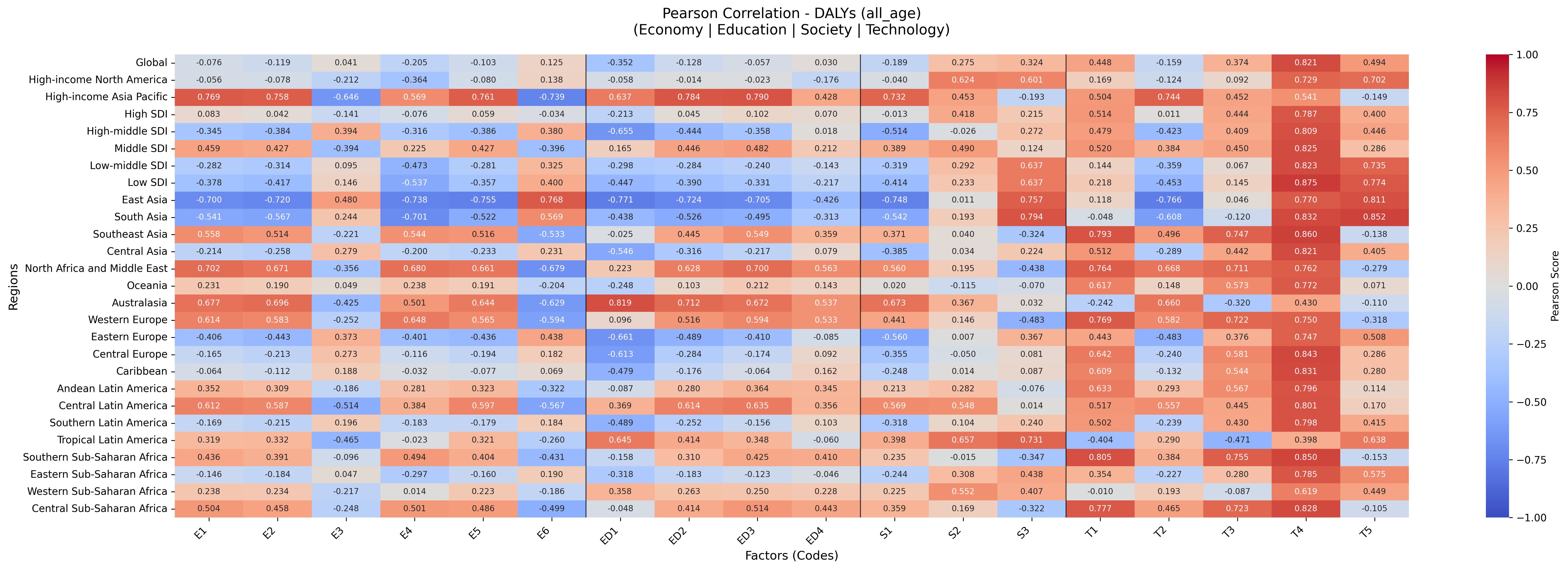 This paper quantifies the age-stratified global burden of four mental disorders in 27 regions from 1990 to 2021 using GBD 2021. To put it in detail, it links the age-standardized years of disability adjustment with 18 world development indicators across economic, educational, social and information technology sectors. Then, by means of Pearson correlation, mutual information, Granger causality and maximum information coefficient and other methods, the linear, nonlinear and lagged dependency relationships were evaluated. After research, it was found that there is a very prominent spatio-temporal heterogeneity among young people aged 20 to 39, and the coupling relationship is stronger. From the overall situation, education corresponds to a low burden. Unemployment corresponds to a high burden. Through lag analysis, it can be known that the influence time of economic and technological factors is relatively short, while that of educational factors is relatively long. These results highlight the macro determinants that play a role at different time scales and also provide population-level references for verifying computational mental health models and for intervention measures in specific regions and for specific ages.