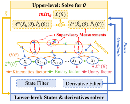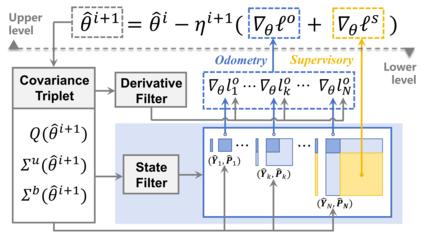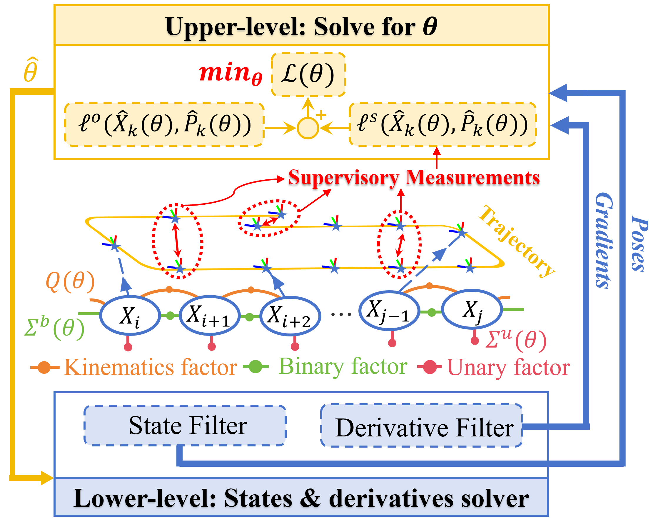 Reliable state estimation hinges on accurate specification of sensor noise covariances, which weigh heterogeneous measurements. In practice, these covariances are difficult to identify due to environmental variability, front-end preprocessing, and other reasons. We address this by formulating noise covariance estimation as a bilevel optimization that, from a Bayesian perspective, factorizes the joint likelihood of so-called odometry and supervisory measurements, thereby balancing information utilization with computational efficiency. The factorization converts the nested Bayesian dependency into a chain structure, enabling efficient parallel computation: at the lower level, an invariant extended Kalman filter with state augmentation estimates trajectories, while a derivative filter computes analytical gradients in parallel for upper-level gradient updates. The upper level refines the covariance to guide the lower-level estimation. Experiments on synthetic and real-world datasets show that our method achieves higher efficiency over existing baselines.