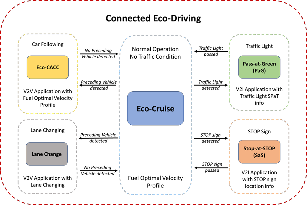 In this paper, a comprehensive Eco-Driving strategy for CAVs is presented. In this setup, multiple driving modes calculate speed profiles ideal for their own set of constraints simultaneously to save fuel as much as possible, while a High Level (HL) controller ensures smooth transitions between the driving modes for Eco-Driving. This Eco-Driving deterministic controller for an ego CAV was equipped with Vehicle-to-Infrastructure (V2I) and Vehicle-to-Vehicle (V2V) algorithms. Simulation results are used to show that the HL controller ensures significant fuel economy improvement as compared to baseline driving modes with no collisions between the ego CAV and traffic vehicles while the driving mode of the ego CAV was set correctly under changing constraints.