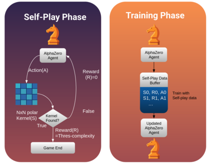Polar codes with large kernels can achieve improved error exponents but are challenging to design with low decoding com- plexity. This work investigates kernel construction under recursive maximum likelihood decoding (RMLD) using a reinforcement learning framework based on the Gumbel AlphaZero algorithm. The proposed method efficiently explores the design space and identifies large-size kernels that satisfy a given error exponent while minimizing decoding complexity. For a size-16 kernel, it achieves 17% lower decoding complexity than handcrafted designs while reaching an error exponent of 0.5183 compared to 0.5 for Arikan's kernel, demonstrating the effectiveness of the learning-based approach for practical polar code construction.