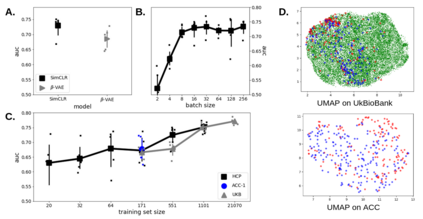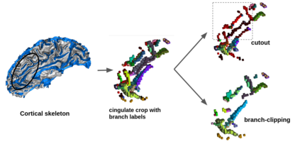 The human cerebral cortex has many bumps and grooves called gyri and sulci. Even though there is a high inter-individual consistency for the main cortical folds, this is not the case when we examine the exact shapes and details of the folding patterns. Because of this complexity, characterizing the cortical folding variability and relating them to subjects' behavioral characteristics or pathologies is still an open scientific problem. Classical approaches include labeling a few specific patterns, either manually or semi-automatically, based on geometric distances, but the recent availability of MRI image datasets of tens of thousands of subjects makes modern deep-learning techniques particularly attractive. Here, we build a self-supervised deep-learning model to detect folding patterns in the cingulate region. We train a contrastive self-supervised model (SimCLR) on both Human Connectome Project (1101 subjects) and UKBioBank (21070 subjects) datasets with topological-based augmentations on the cortical skeletons, which are topological objects that capture the shape of the folds. We explore several backbone architectures (convolutional network, DenseNet, and PointNet) for the SimCLR. For evaluation and testing, we perform a linear classification task on a database manually labeled for the presence of the "double-parallel" folding pattern in the cingulate region, which is related to schizophrenia characteristics. The best model, giving a test AUC of 0.76, is a convolutional network with 6 layers, a 10-dimensional latent space, a linear projection head, and using the branch-clipping augmentation. This is the first time that a self-supervised deep learning model has been applied to cortical skeletons on such a large dataset and quantitatively evaluated. We can now envisage the next step: applying it to other brain regions to detect other biomarkers.