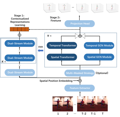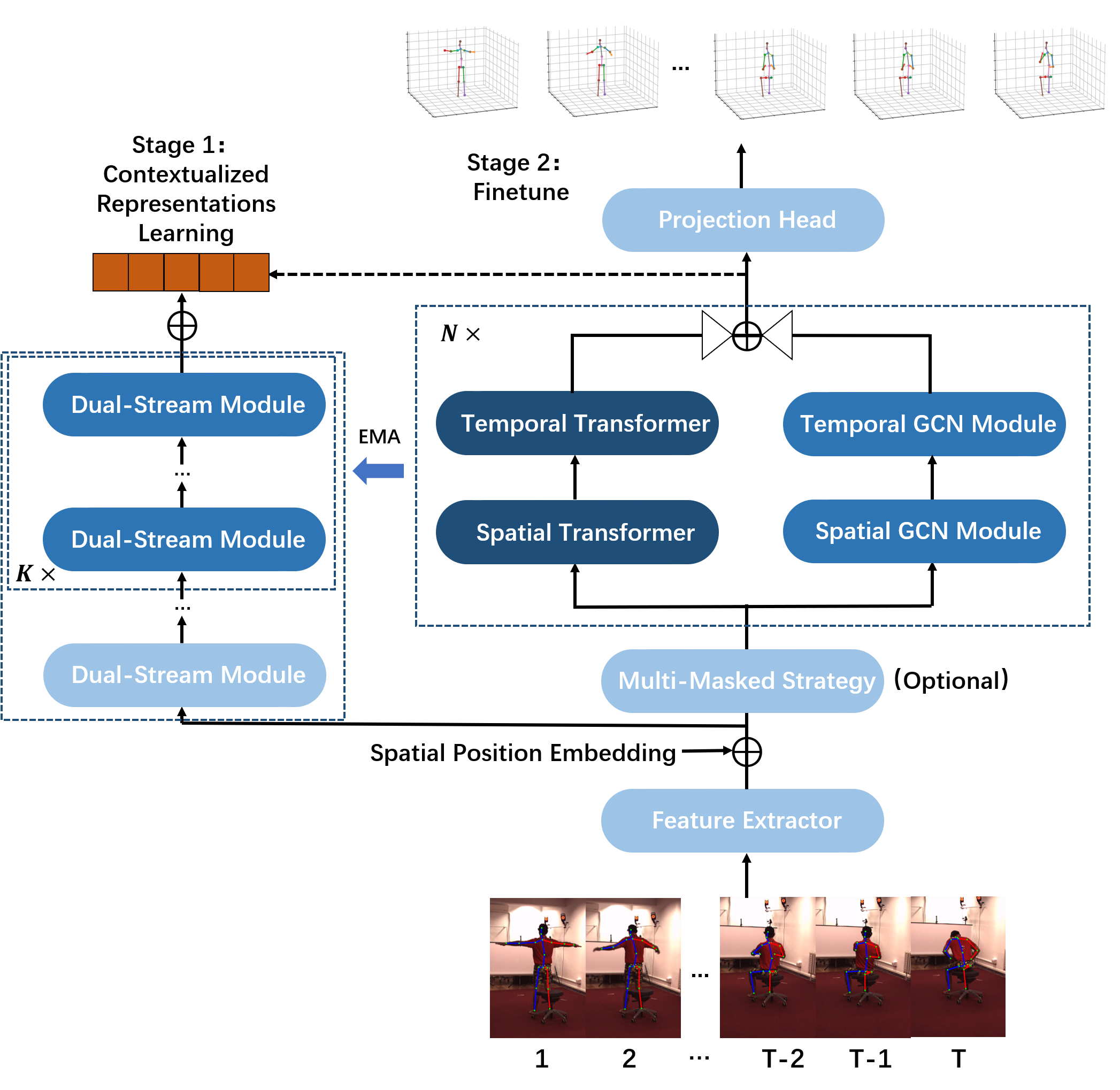 This paper introduces a novel approach to monocular 3D human pose estimation using contextualized representation learning with the Transformer-GCN dual-stream model. Monocular 3D human pose estimation is challenged by depth ambiguity, limited 3D-labeled training data, imbalanced modeling, and restricted model generalization. To address these limitations, our work introduces a groundbreaking motion pre-training method based on contextualized representation learning. Specifically, our method involves masking 2D pose features and utilizing a Transformer-GCN dual-stream model to learn high-dimensional representations through a self-distillation setup. By focusing on contextualized representation learning and spatial-temporal modeling, our approach enhances the model's ability to understand spatial-temporal relationships between postures, resulting in superior generalization. Furthermore, leveraging the Transformer-GCN dual-stream model, our approach effectively balances global and local interactions in video pose estimation. The model adaptively integrates information from both the Transformer and GCN streams, where the GCN stream effectively learns local relationships between adjacent key points and frames, while the Transformer stream captures comprehensive global spatial and temporal features. Our model achieves state-of-the-art performance on two benchmark datasets, with an MPJPE of 38.0mm and P-MPJPE of 31.9mm on Human3.6M, and an MPJPE of 15.9mm on MPI-INF-3DHP. Furthermore, visual experiments on public datasets and in-the-wild videos demonstrate the robustness and generalization capabilities of our approach.