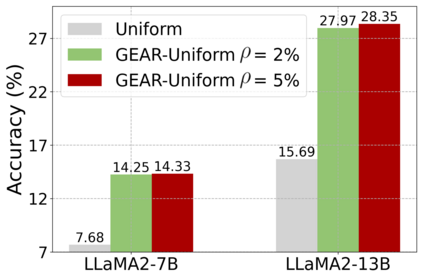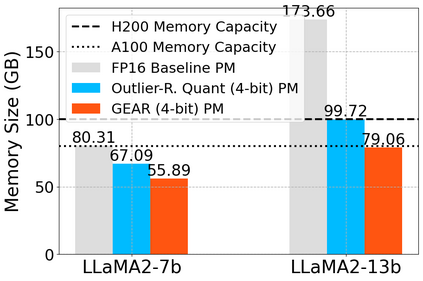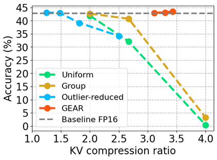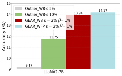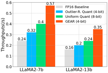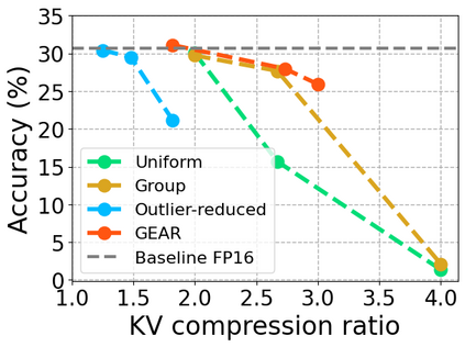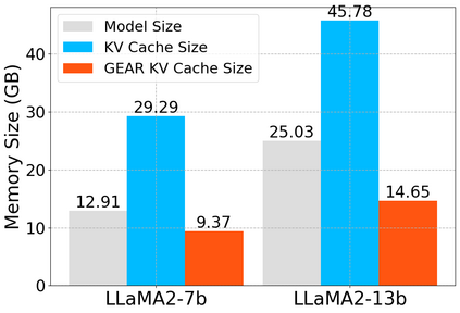 Key-value (KV) caching has become the de-facto to accelerate generation speed for large language models (LLMs) inference. However, the growing cache demand with increasing sequence length has transformed LLM inference to be a memory bound problem, significantly constraining the system throughput. Existing methods rely on dropping unimportant tokens or quantizing all entries uniformly. Such methods, however, often incur high approximation errors to represent the compressed matrices. The autoregressive decoding process further compounds the error of each step, resulting in critical deviation in model generation and deterioration of performance. To tackle this challenge, we propose GEAR, an efficient KV cache compression framework that achieves near-lossless high-ratio compression. GEAR first applies quantization to majority of entries of similar magnitudes to ultra-low precision. It then employs a low rank matrix to approximate the quantization error, and a sparse matrix to remedy individual errors from outlier entries. By adeptly integrating three techniques, GEAR is able to fully exploit their synergistic potentials. Our experiments demonstrate that compared to alternatives, GEAR achieves near-lossless 4-bit KV cache compression with up to 2.38x throughput improvement, while reducing peak-memory size up to 2.29x. Our code is publicly available at https://github.com/HaoKang-Timmy/GEAR.