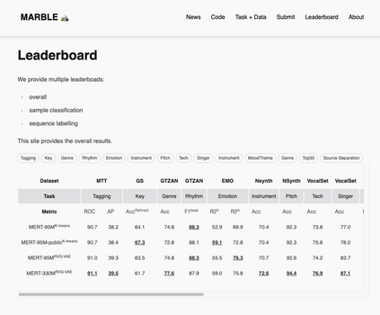 In the era of extensive intersection between art and Artificial Intelligence (AI), such as image generation and fiction co-creation, AI for music remains relatively nascent, particularly in music understanding. This is evident in the limited work on deep music representations, the scarcity of large-scale datasets, and the absence of a universal and community-driven benchmark. To address this issue, we introduce the Music Audio Representation Benchmark for universaL Evaluation, termed MARBLE. It aims to provide a benchmark for various Music Information Retrieval (MIR) tasks by defining a comprehensive taxonomy with four hierarchy levels, including acoustic, performance, score, and high-level description. We then establish a unified protocol based on 14 tasks on 8 public-available datasets, providing a fair and standard assessment of representations of all open-sourced pre-trained models developed on music recordings as baselines. Besides, MARBLE offers an easy-to-use, extendable, and reproducible suite for the community, with a clear statement on copyright issues on datasets. Results suggest recently proposed large-scale pre-trained musical language models perform the best in most tasks, with room for further improvement. The leaderboard and toolkit repository are published at https://marble-bm.shef.ac.uk to promote future music AI research.
